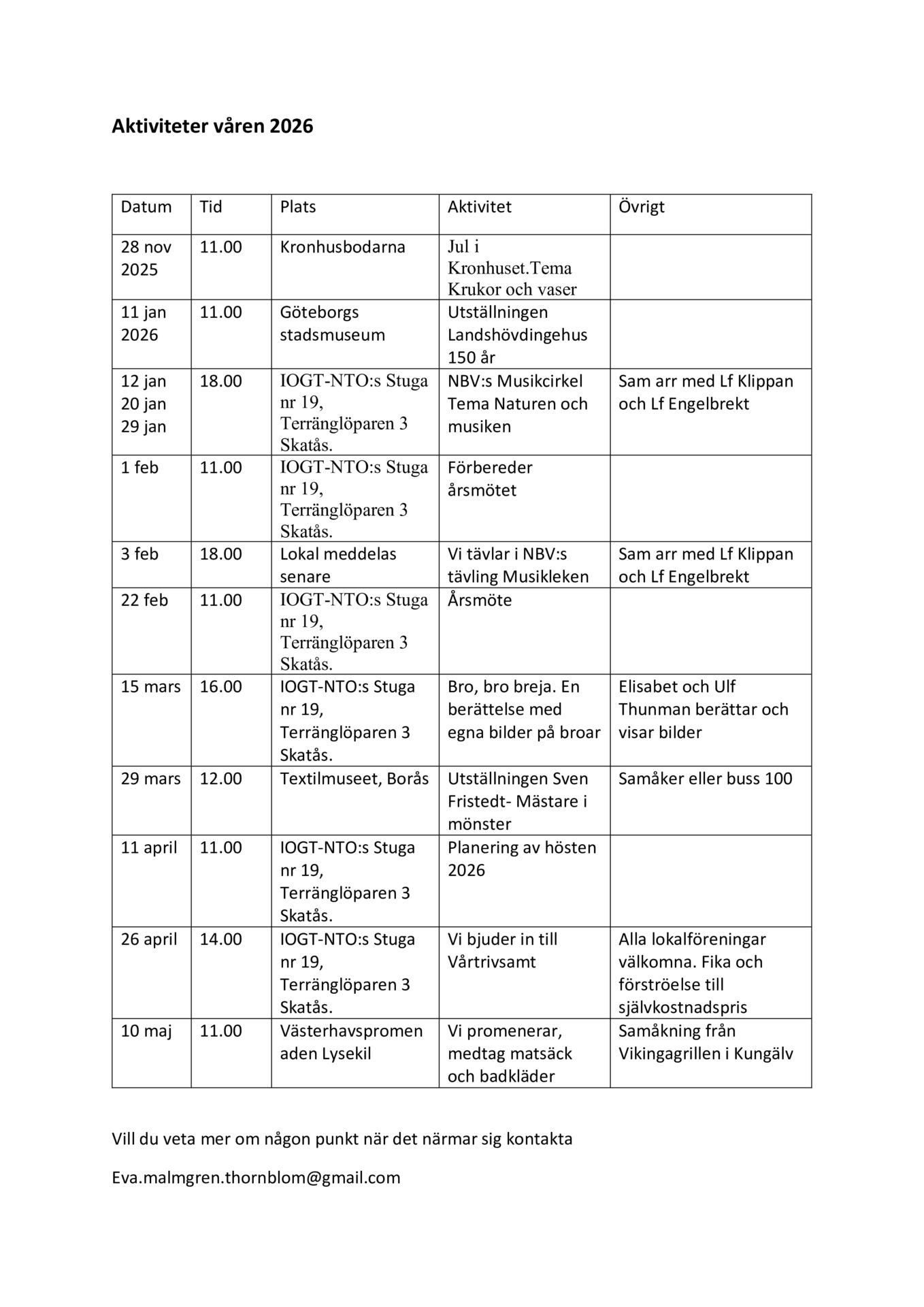 Vill du komma med kontakta oss senast onsdag samma vecka eller genom att anmäla att du vill vara med på vår maillista till nedanstående person.